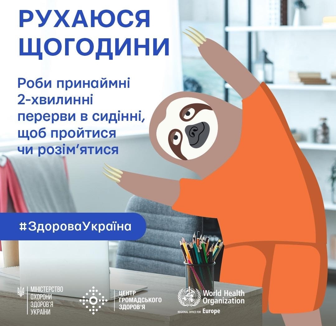 Сучасна людина, що працює вдома чи в офісі проводить більш ніж достатньо часу сидячи. Але фізична активність допомагає нам залишатись здоровими, тому кожної години важливо виділяти час для рухової активності. Щоб не забувати можна поставити на телефоні чи на смарт-годинник нагадування щогодини вставати хоч б на пару хвилин.
