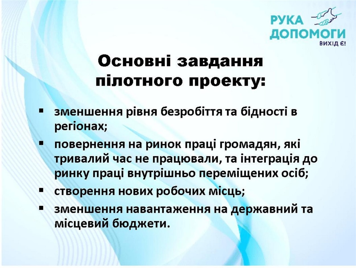 Раніше программа "Рука допомоги" діяла як пілотний проєкт започаткований Міністерством соціальної політики України за підтримки Світового банку. Тоді понад 230 довготривалих безробітних у трьох областях отримали безвідсоткову поворотну допомогу від держави на початок власної справи. Більшість з них успішно працюють і сьогодні.